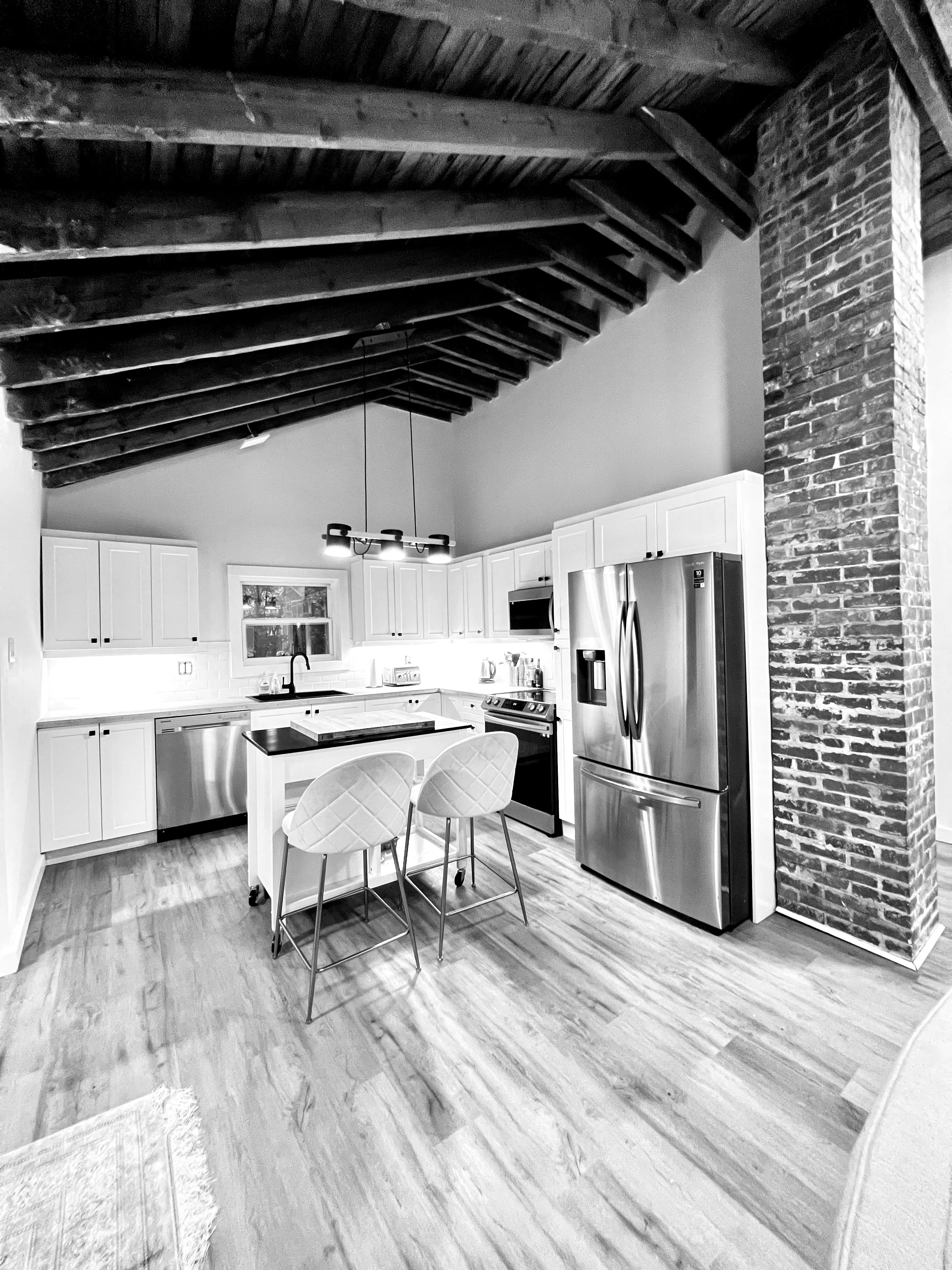 All interior walls and ceilings were removed, the roof structure was reworked, and the ceiling height was raised to a dramatic 22-foot peak. The roof was insulated from the exterior and finished with a new metal roof, while new flooring, kitchen, and bathroom were installed. The entire renovation was completed in just two months.