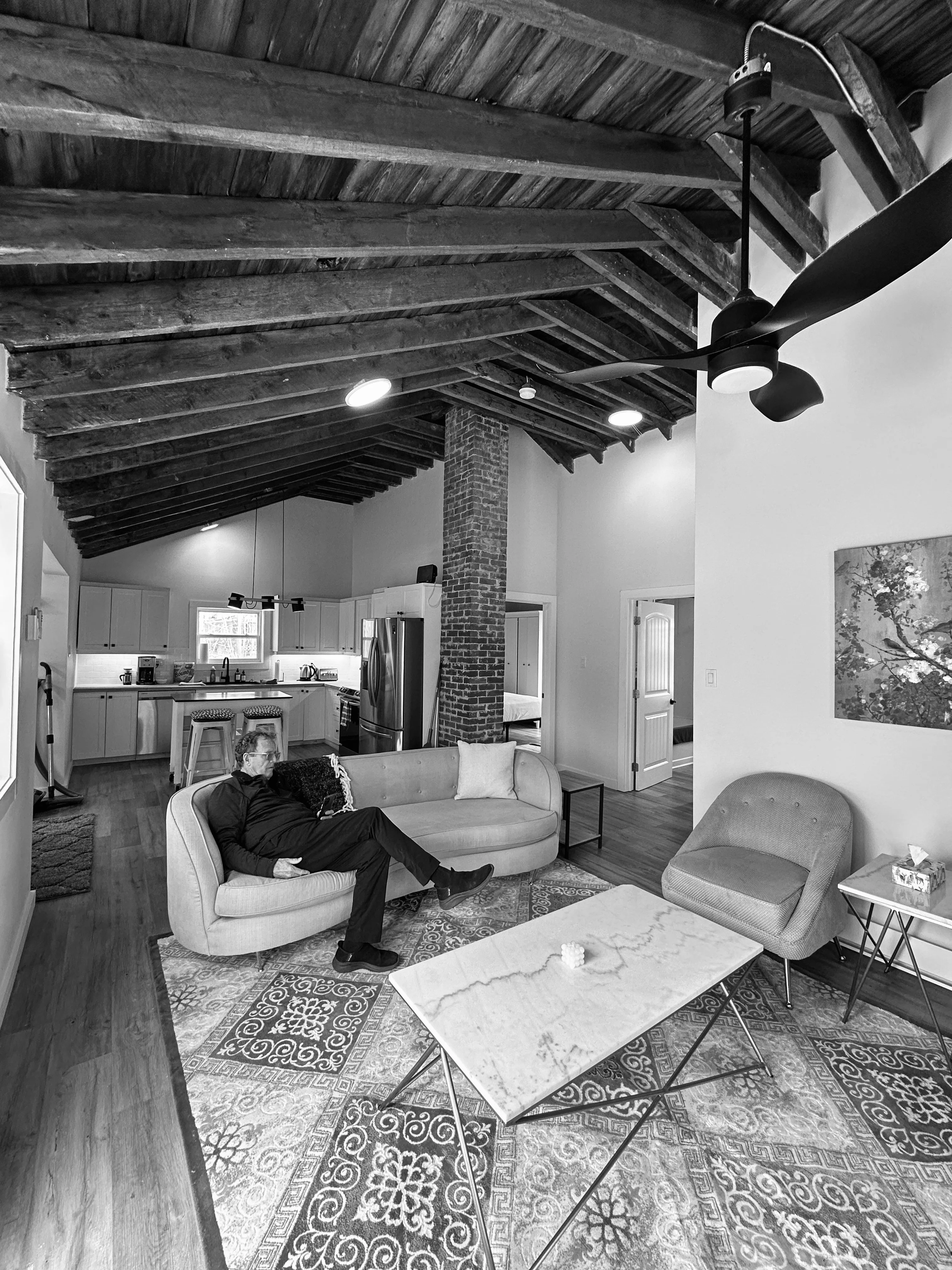 A strategic renovation maximizing ceiling height and volume through structural exposure.